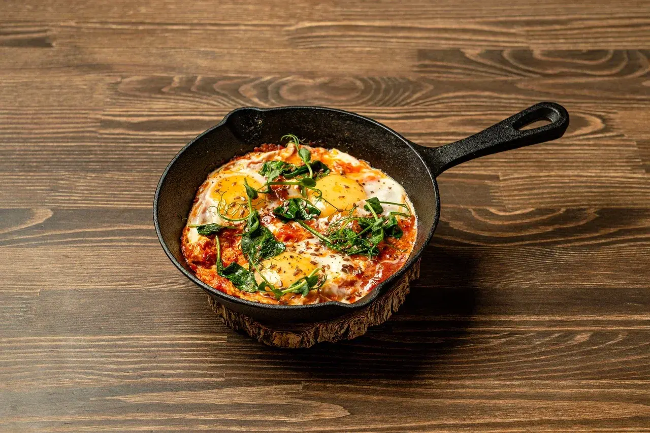 Состав: куриные яйца, томаты в собственном соку, томаты свежие, шпинат, лук, семена льна, соль, перец