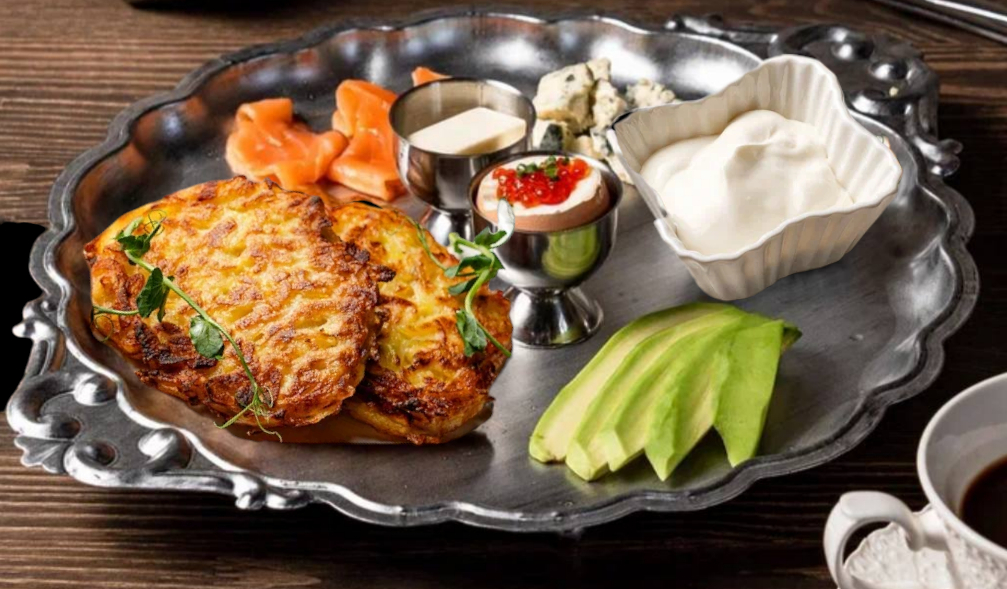 Состав: яйцо всмятку, красная икра, мурманский лосось, сыр горгонзола, картофельные драники, сметана, авокадо