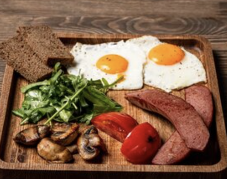 Состав: глазунья из 2х яиц, сарделька из мяса косули, печеные томаты, шампиньоны, микс зелени