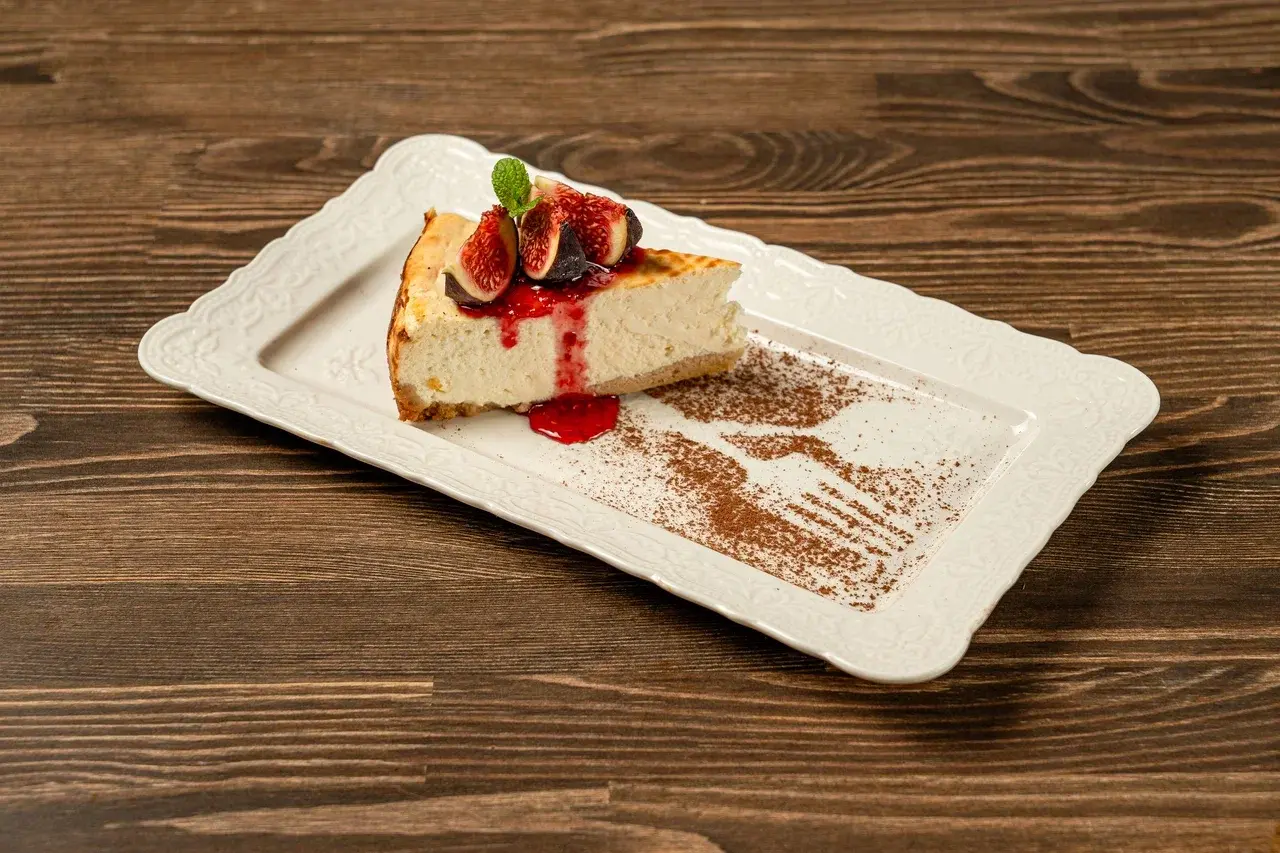 Состав: печенье, творожный сыр, масло сливочное, сахар, сливки, яйца, голубика, клубника, мята
