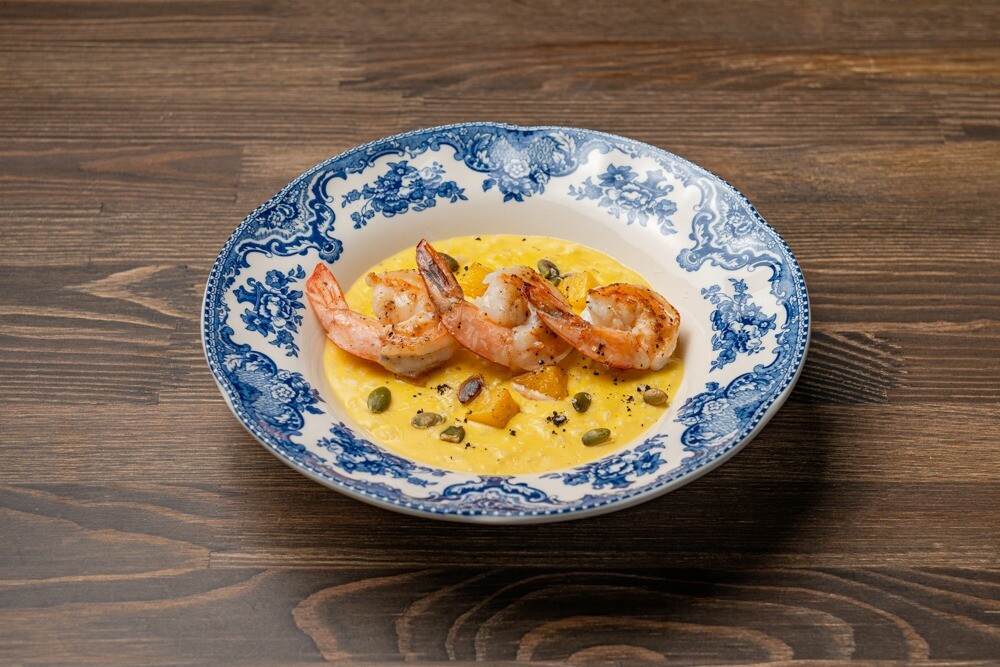 Состав: ризотто, магаданские креветки, тыква, сливки, масло сливочное, пармезан, тыквенные семечки, земля из маслин