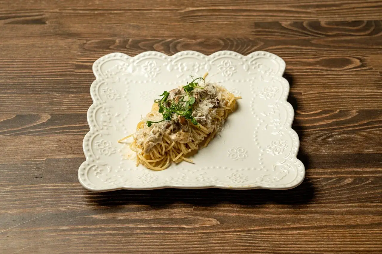 Состав: спагетти, шампиньоны, пармезан, паста трюфельная, базилик, сливки, масло сливочное, масло растительное, соль, перец молотый