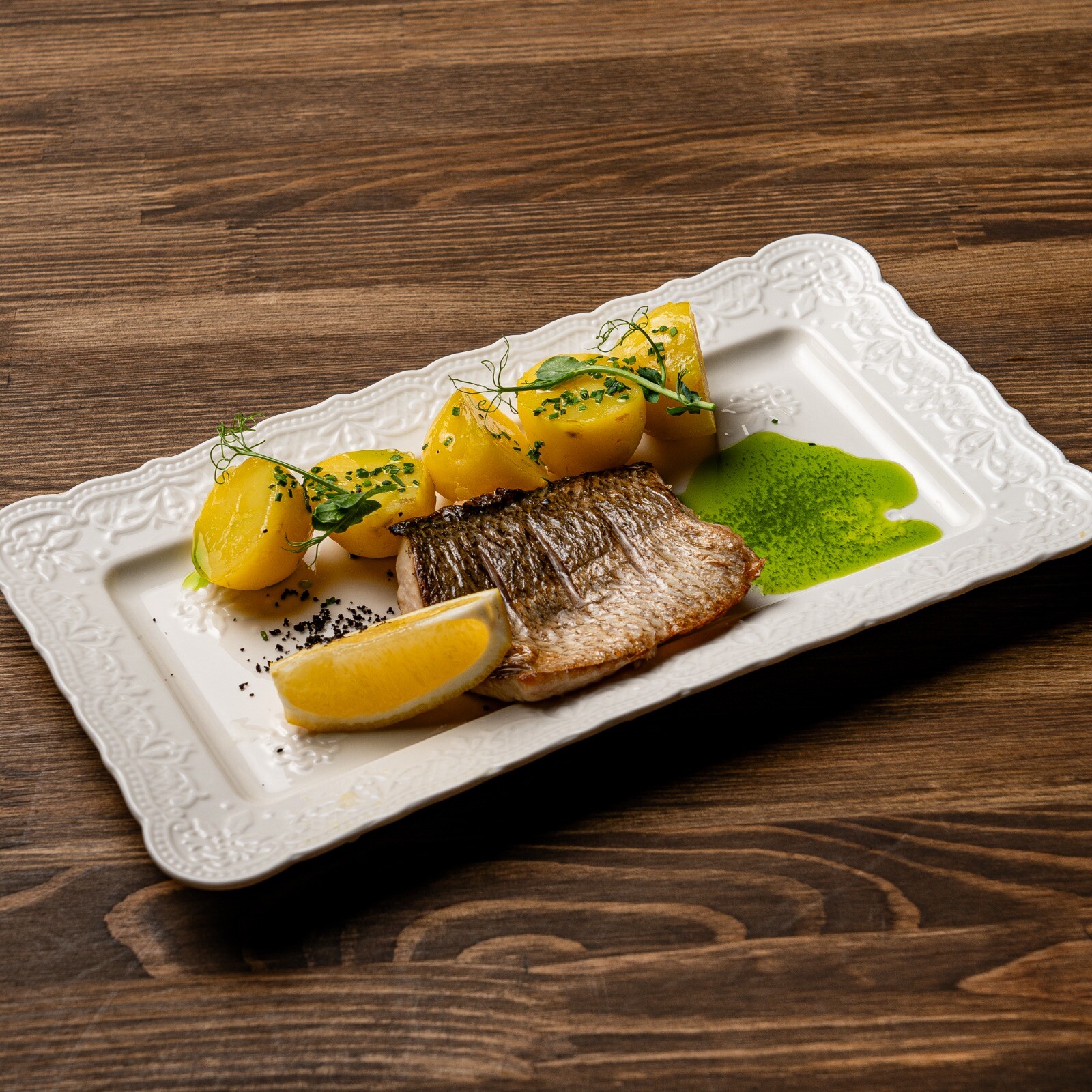 Запеченное филе муксуна в соли, с молодым картофелем в соусе из ароматной зелени