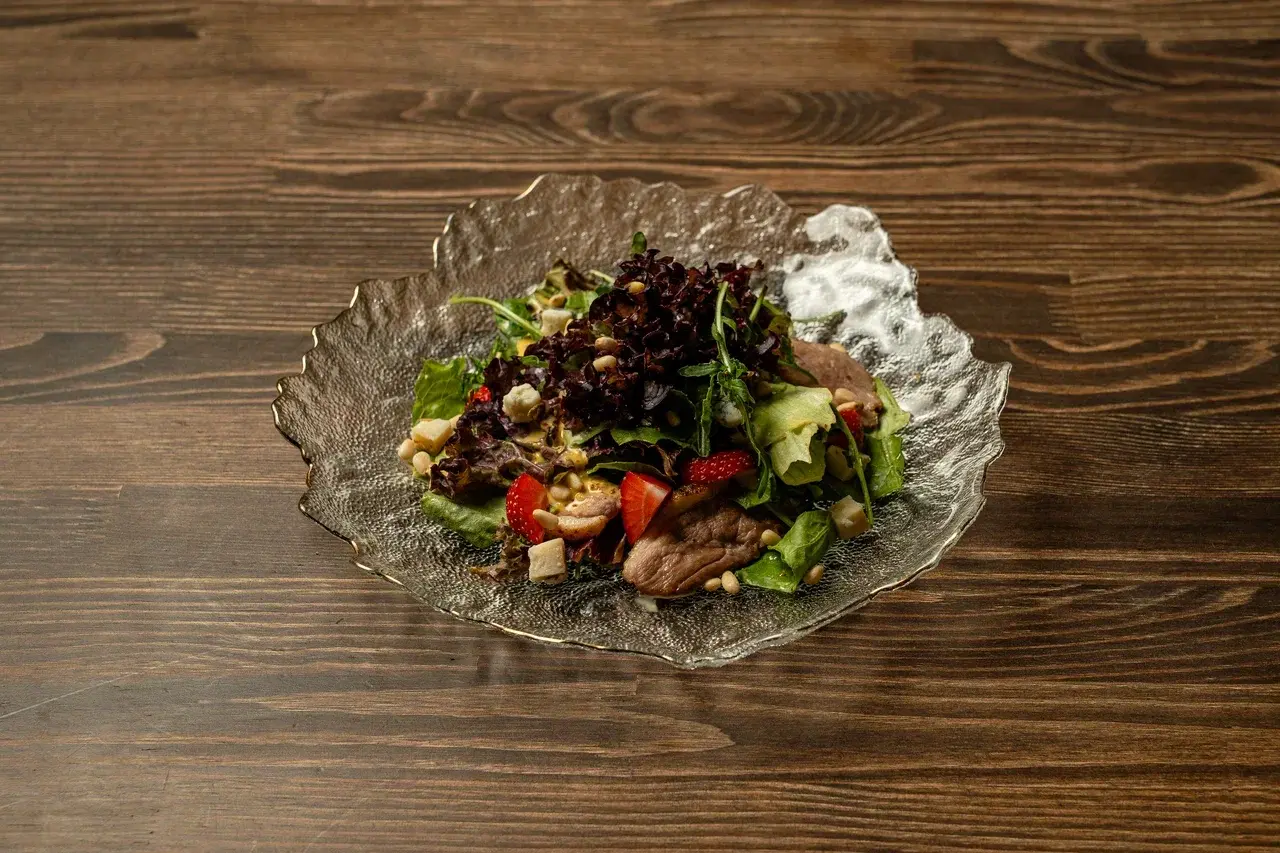 Салат с запечённой дикой уткой, сыром горгонзола, сезонной ягодой, кедровым орехом и фирменной заправкой от шеф-повара
